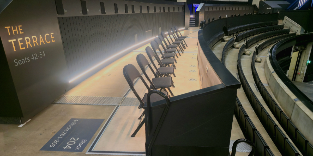 Please note: Ground floor and level 2 accessible areas use a flexible seating arrangement with Sandler seating. The accessible areas on Level 2 (shown below) include a walkway providing access to the seating blocks located behind it.